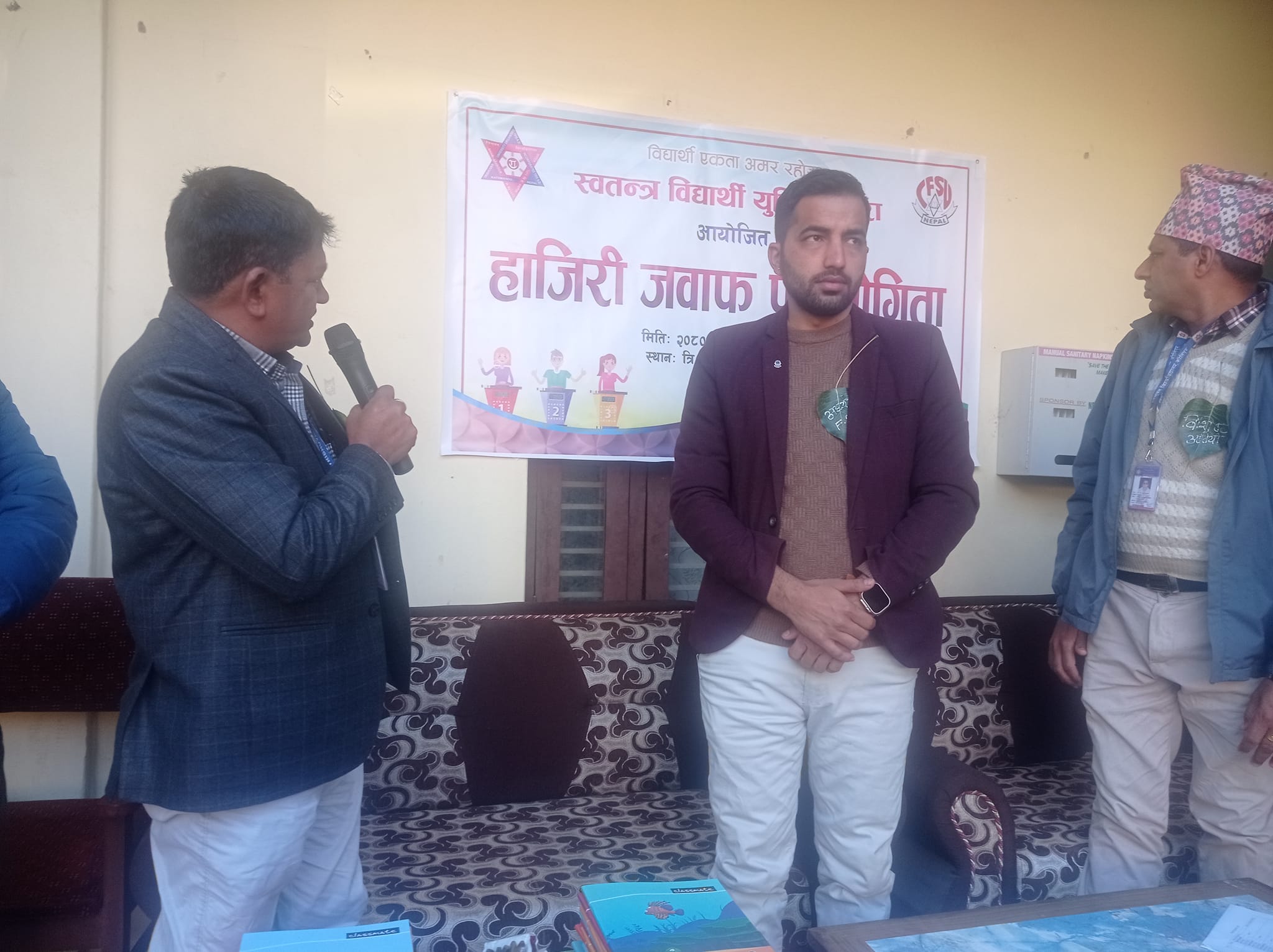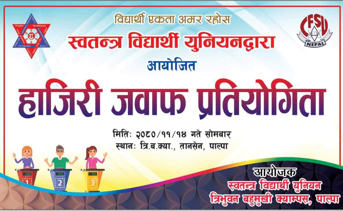 त्रिभुवन बहुमुखी क्याम्पस स्वतन्त्र विद्यार्थी युनियनको आयाेजनामा हाजिरी जवाफ प्रतियोगिता सञ्चालन भयो । अतिरिक्त कार्यक्रमअन्तर्गत खुला हाजिरीजवाफ प्रतियोगिता सम्पन्न भएको हाे । उद्घाटन सत्रकाे अध्यक्षता स्ववियु सभापति कृष्ण अर्यालले गर्नुभएको हाे । कार्यक्रमकाे प्रमुख अतिथिका रूपमा क्यम्पस प्रमुख टंकप्रसाद भट्टराई हुनुहुन्थ्यो । कार्यक्रमकाे उद्देशमाथि प्रकाश पार्ने काम स्ववियु सभापति कृष्ण अर्यालले गर्नुभएको हाे । हाजिरी जवाफ सञ्चालनकाे संयाेजकका रूपमा स्ववियु उपाध्यक्ष अमृत भट्टराईलाई ताेकिएकाे हाे । कार्यक्रममा हाजिरीजवाफ प्रतियोगिताकाे सञ्चालन र सहजीकरण गर्ने काम स्ववियु सदस्यद्वय सुदर्शन पाण्डे र सुशील बस्यालले गर्नुभएको हाे । प्रथम राउन्डमा २२ समूहकाे सहभागिता भएकोमा छनाेट चरणबाट १२ समूहका बिचमा प्रतिस्पर्धा गराई प्रथम, द्वितीय र तृतीयलाई पुरस्कृत गरिने जानकारी संयाेजक अमृत भट्टराईले दिनुभयो । उद्घाटन सत्रकाे सञ्चालन स्ववियु सचिव ताराबहादुर रायमाझीले गर्नुभएको हाे ।