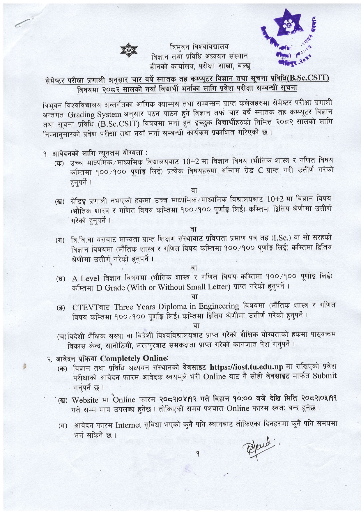 स्नातक तह B.Sc.CSIT िवषयमा २०८२ सालकाे नयाँ विद्यार्थी भर्नाका लागि प्रवेश परीक्षा सम्बन्धी सूचना