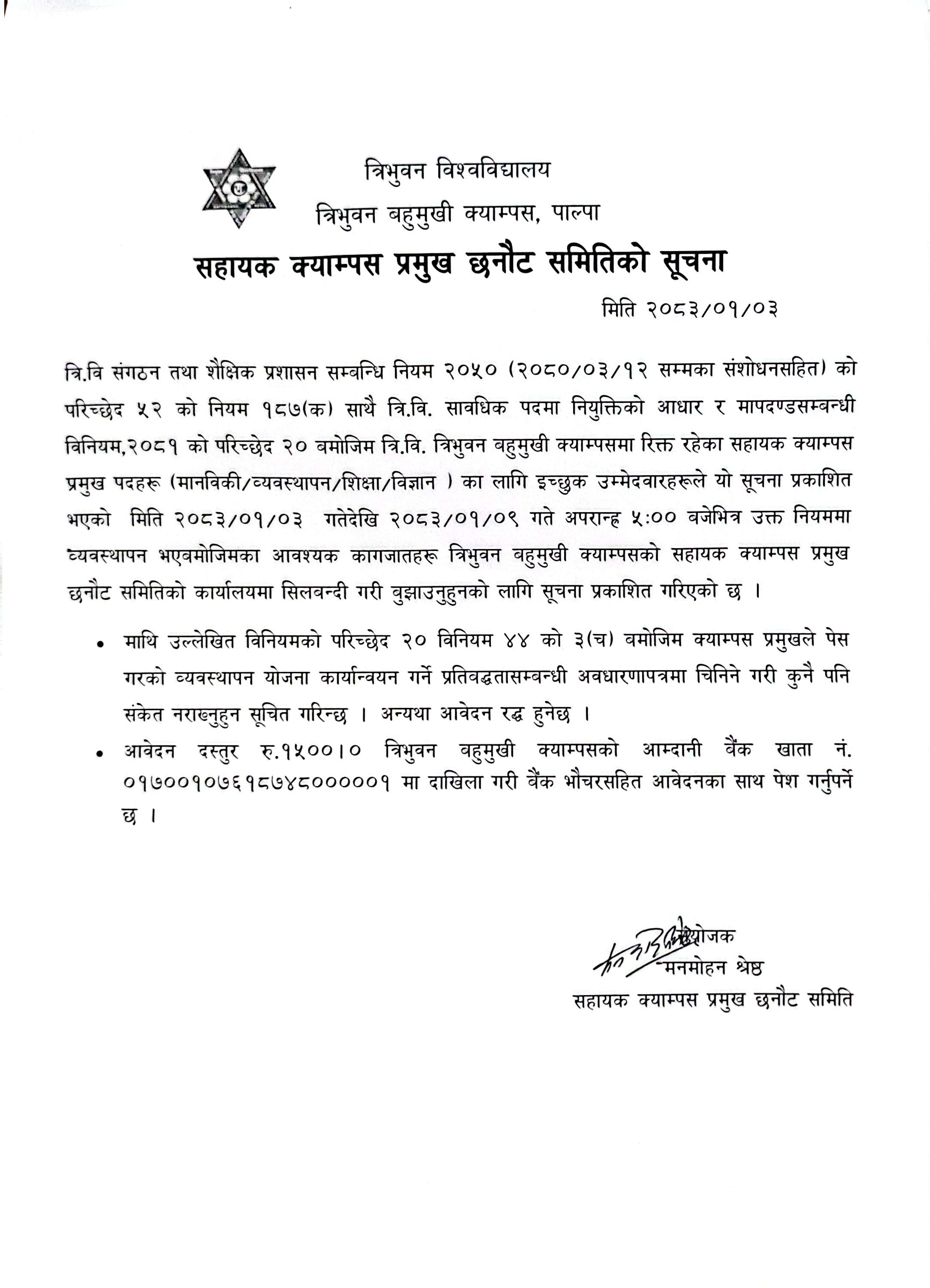सहायक क्याम्पस प्रमुख छनौट समितिको सूचना ।