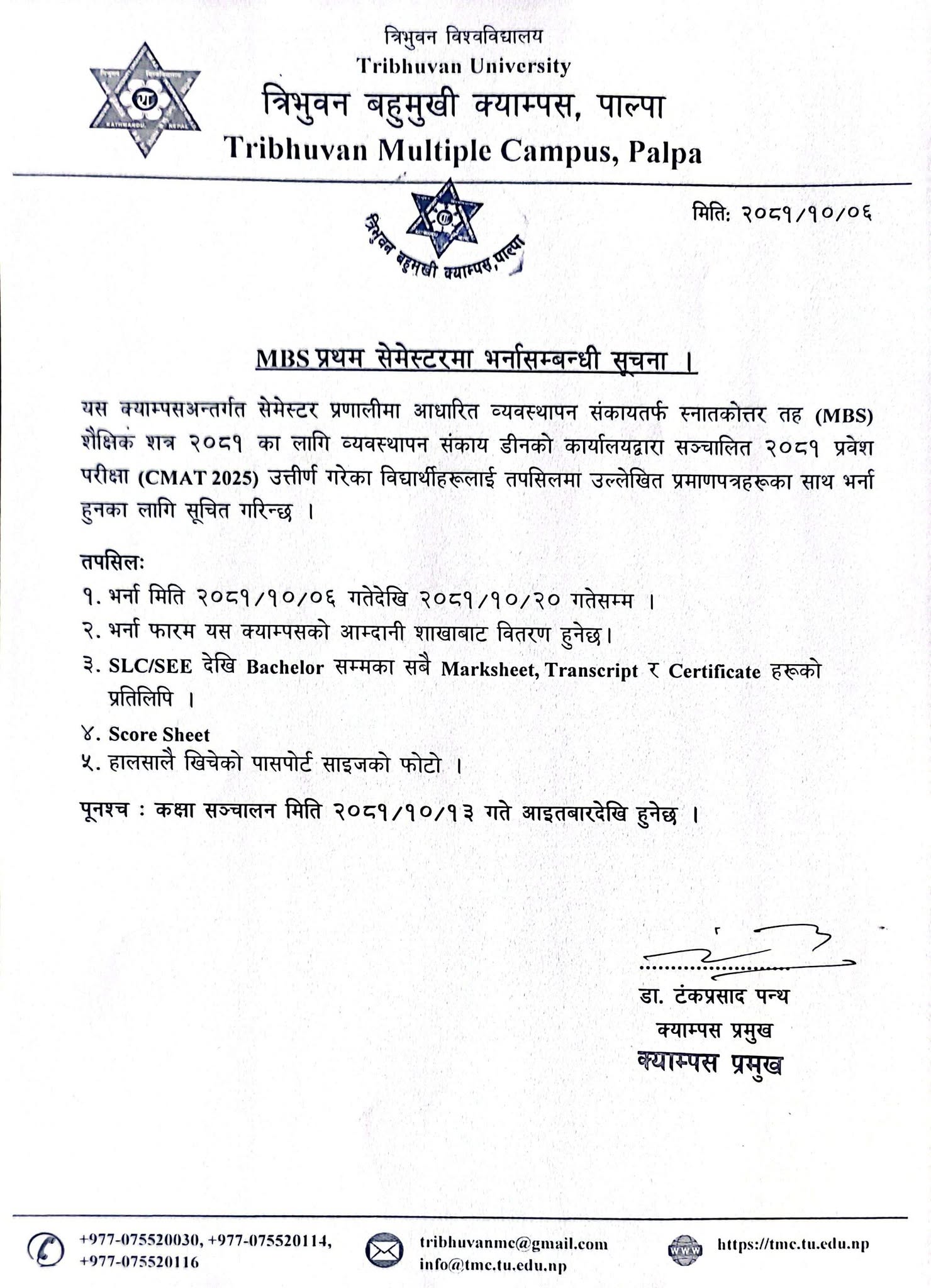 MBS प्रथम सेमेस्टरमा भर्नासम्बन्धी सूचना ।