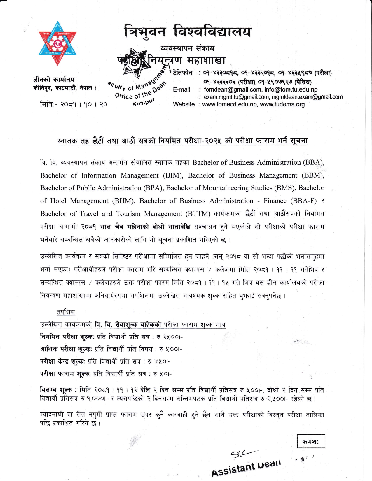 Notice regarding filling up the exam form for BBA VI & VIII Semester