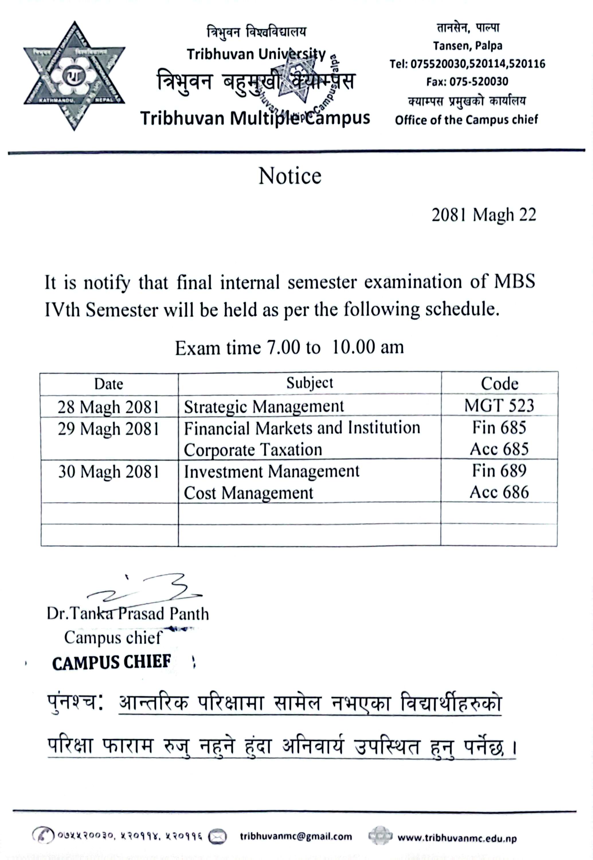 Notice for Final Internal Examination of MBS IV Semester.