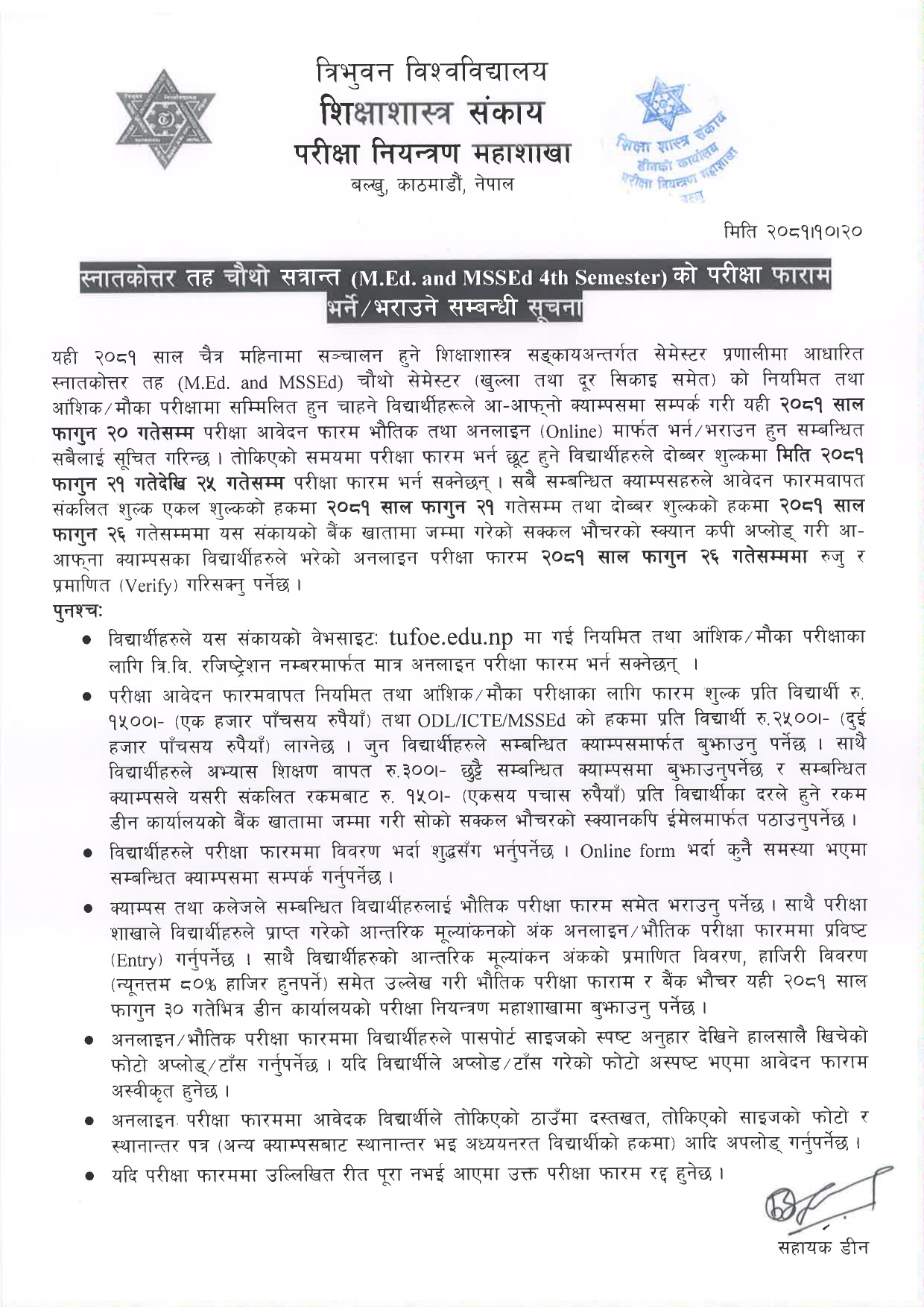 M.Ed. चौथो सेमेस्टरको परीक्षा फारमसम्बन्धी सूचना ।