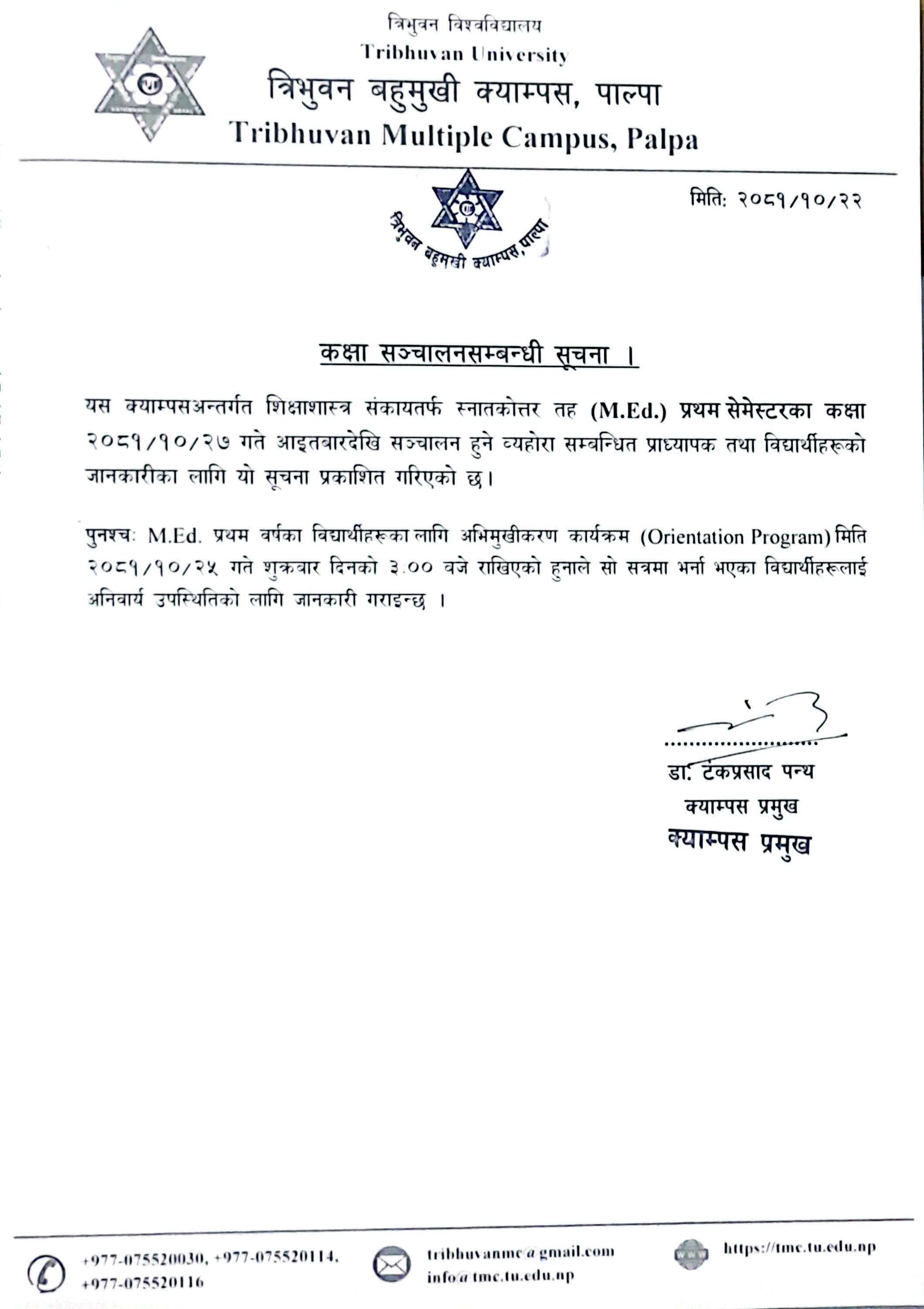 M.Ed. प्रथम सेमेस्टरको कक्षा सञ्चालन सम्बन्धी सूचना ।