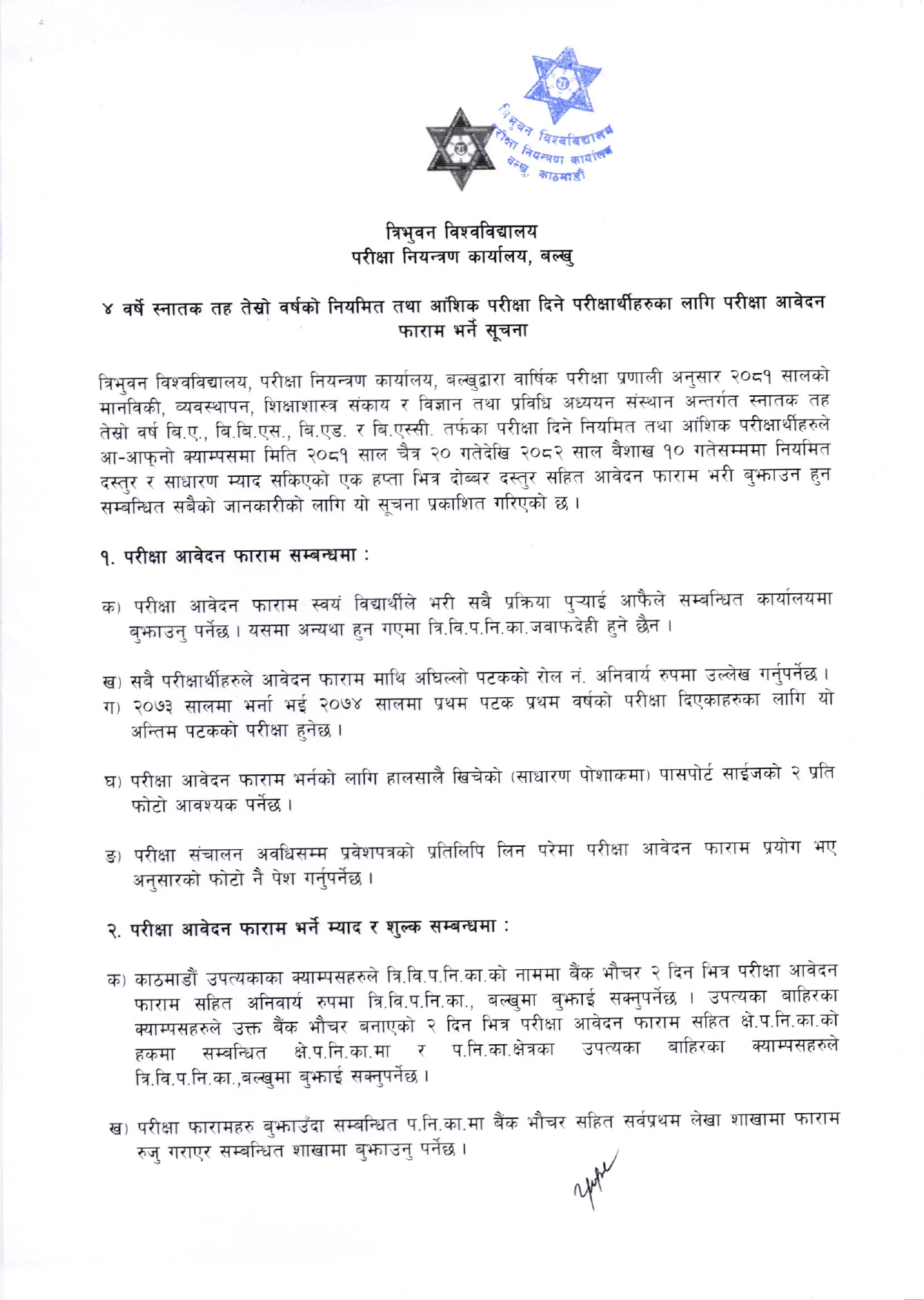 ४ वर्षे स्नातक तह तेश्रो वर्षको नियमित तथा आंशिक परीक्षा फारमसम्बन्धी सूचना ।